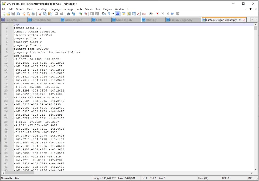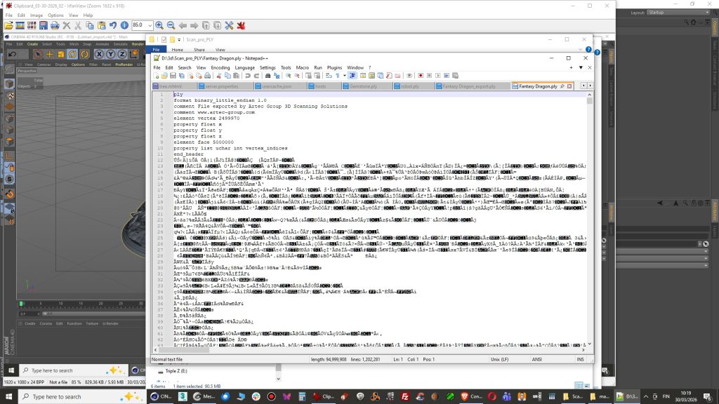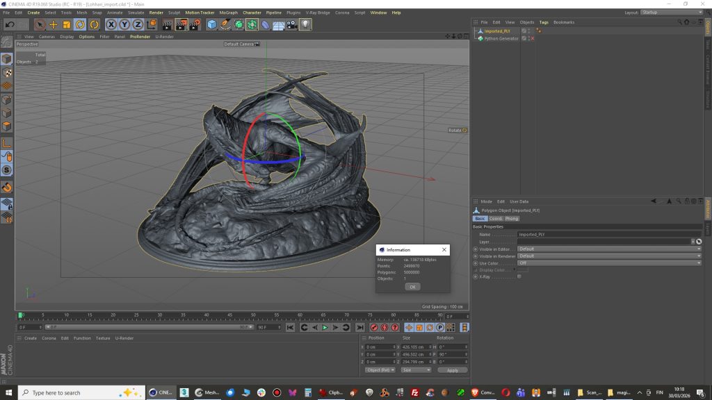 This time file needed to be converted into ascii format inside Meshlab because it was produced by scanner software as binary file. It opens in Meshlab for sure but not with Cinema 4D PLY importer python script.